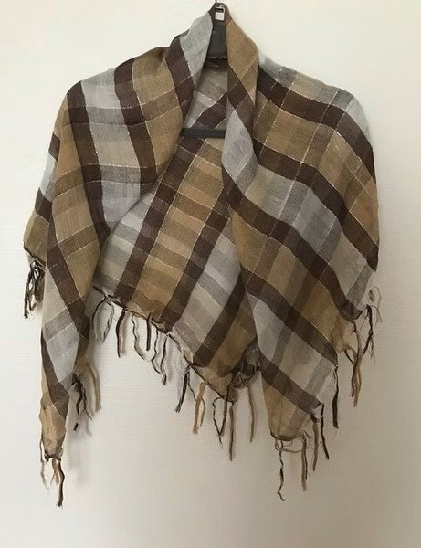 Rutig sjal med fransar i olika bruna och grå nyanser. Sjalen hänger på en galge.