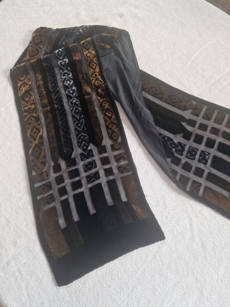 Tunn och mjukt i brunt/guldskimrande sammetsliknande tyg. Mönstret är delvis utskuret med tunt tyg bakom. 150x50cm