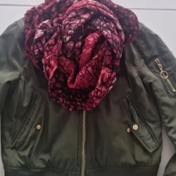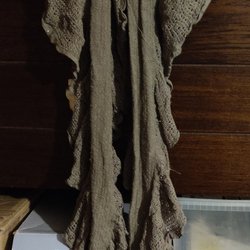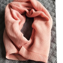 Sjal med ränder i rosa, gult, lila och grått. Sjalen har fransar i ändarna.
