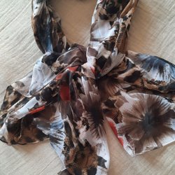 Sjal med ränder i rosa, gult, lila och grått. Sjalen har fransar i ändarna.