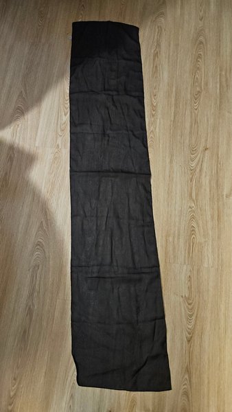 Svart rektangulär polyestersjal, 150xm lång och ca 33cm bred.