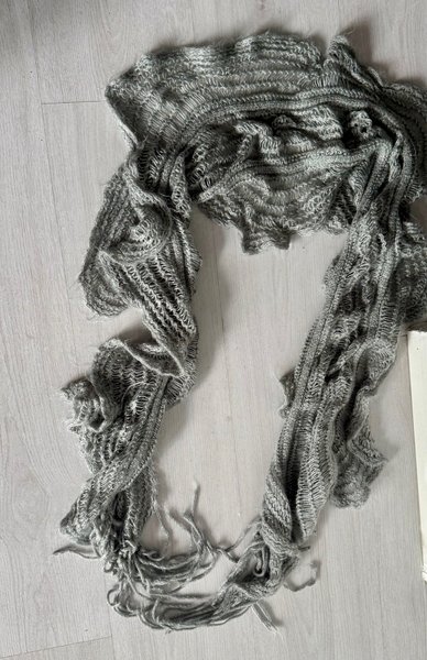 Grå stickad sjal med fransar. Sjalen har ett öppet stickat mönster.
