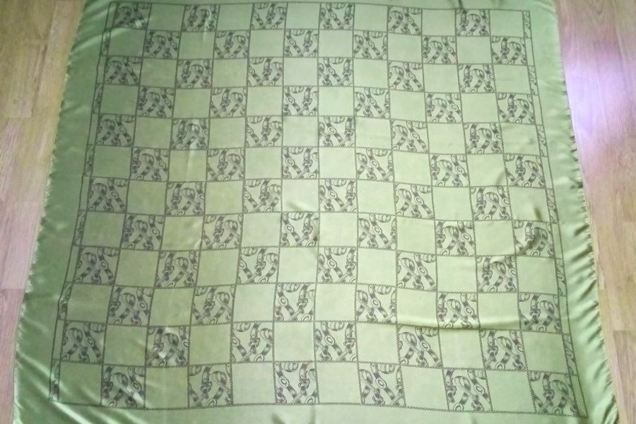 Elegant siden scarf med ett schackmönster av stiliserade bälten. Den har en ljusgrön färg.