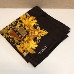 Fyrkantig scarf med ett detaljerat mönster av guldfärgade kedjor och spännen mot en brun bakgrund. Mönstret inkluderar även ljusare beigea och vita inslag som ramar in de guldfärgade detaljerna. Scarfens kanter är avslutade med en enfärgad ljusbrun bård.