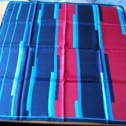 Scarf med detaljerat mönster som inkluderar djur och växter i en livlig komposition. Ena sidan har ett upprepat mönster av stiliserade länkar. Sjalen har en kant i en kontrasterande färg. Kan användas som accessoar men även som en sjal över axlar . Snygga mönster båda sidor