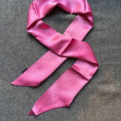 Röd scarf med svarta och vita prickar. Kan knytas på olika sätt, till exempel runt halsen eller i håret.