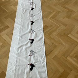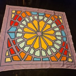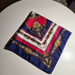 Scarfens design inkluderar även små illustrationer av båtar, fiskar, ankare, svanar och rosor.