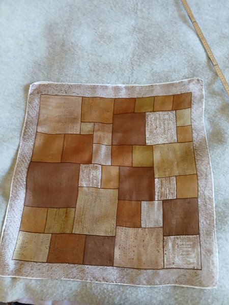 Fyrkantig sjal med ett mönster av rutor i olika nyanser av brunt och beige. Sjalen har en kant runt om med ett mönster som liknar små prickar eller textur. Troligen konstsiden, 64x67g, 39g.