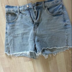 Jeansshorts i ljus denim med vita stjärnor. Shortsen har en avslappnad passform, synliga slitningar framtill och uppvikta benslut.
