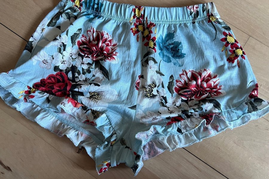 Lyseblå shorts med blomsterprint og flæsekanter. Shortsne har elastik i taljen.