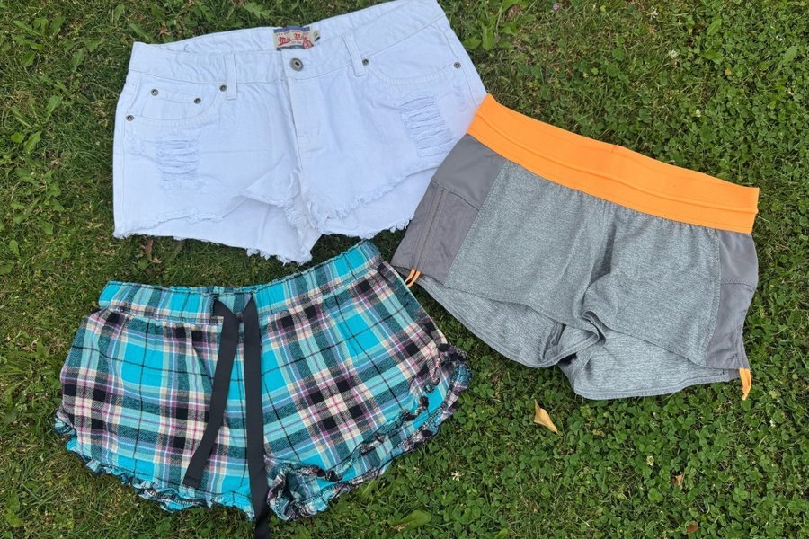 Ett set med tre par shorts. Ett par vita denimshorts med slitna detaljer, ett par grå sportshorts med orange linning och ett par blå- och svartrutiga shorts med spetskant och band.