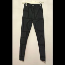 Ett par svarta leggings med ett mönster i rött, vitt och grått. Texten ”BONA LADIES” är tryckt diagonalt över benen.