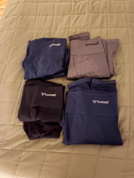 Här är ett set med träningskläder från Hummel. Setet innehåller tights i olika färger. 2 mörk blåa och 1 grå 1 svart