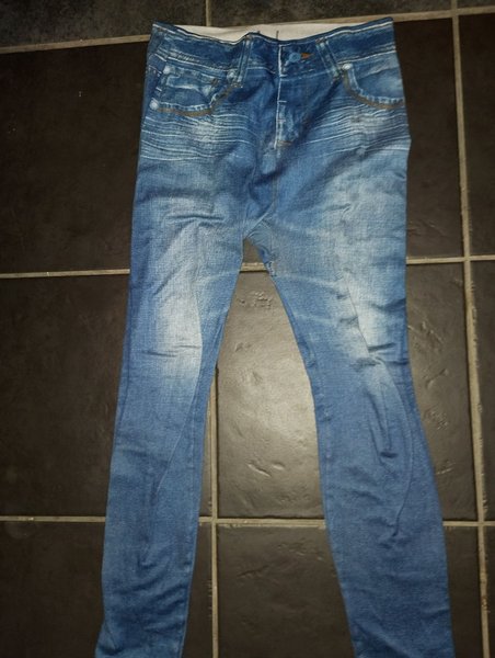 Ett par leggings med tryckt denim-mönster. Byxorna har en ljusblå färg och en design som efterliknar jeans.