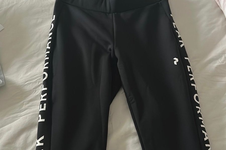 Svarta träningsbyxor från Peak Performance med vit logga längs benen. Byxorna har en resår i midjan. Helt nya och aldrig ens provade. Jättesnygga men tyvärr fel storlek för mig. Köpta för 1199kr. Säljer dom för 600kr bara.