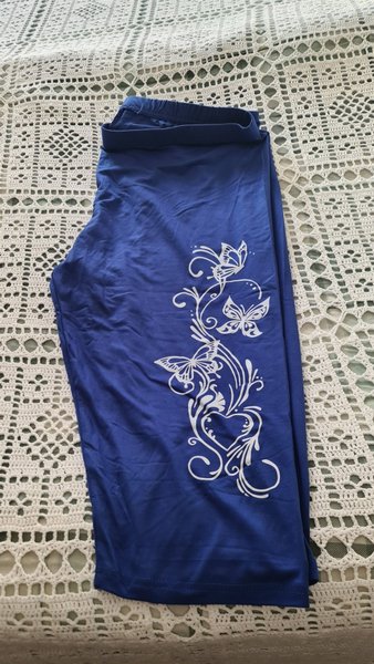 Blåa leggings med ett vitt fjärilsmönster längs ena benet. Mönstret inkluderar fjärilar och snirkliga detaljer som bildar ett hjärta.