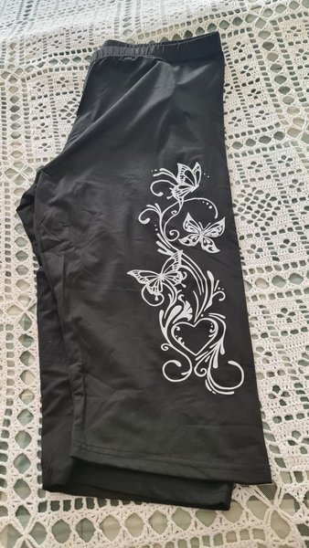 Svarta leggings med ett vitt tryck av fjärilar och ett hjärta på ena benet. Resår i midjan.
