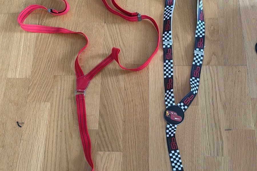 Ett par för ungdomar röda hängslen med svarta ränder och metallspännen. Ett par för barn svarta hängslen med rutigt mönster, siffran 95 och en bild på Blixten McQueen. Båda hängslena har metallspännen.