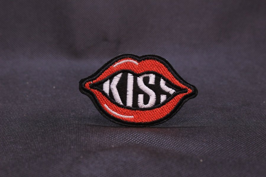 Broderad patch i form av en mun med texten "KISS".
