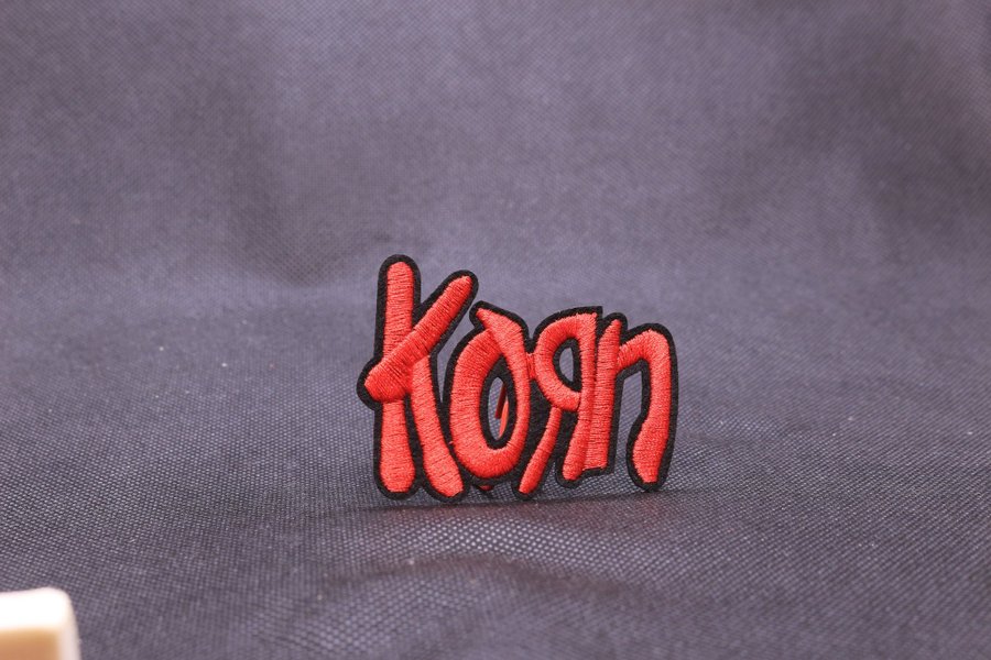 Ett rött broderat märke med texten "Korn" i svart kontur.