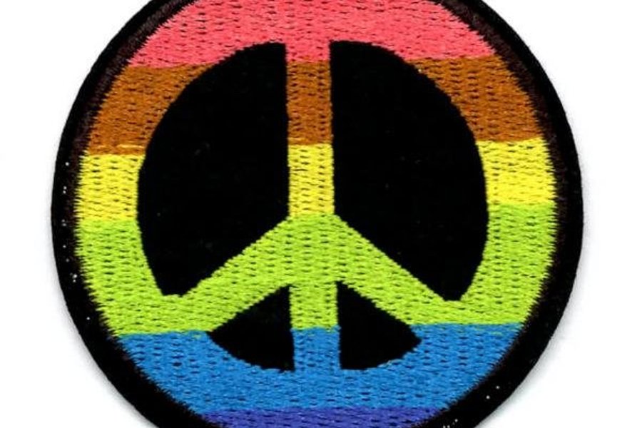 Här är fredsmärket kombinerat med regnbågsflaggan/pride-flaggan viken också är en freds- och kärlekssymbol.