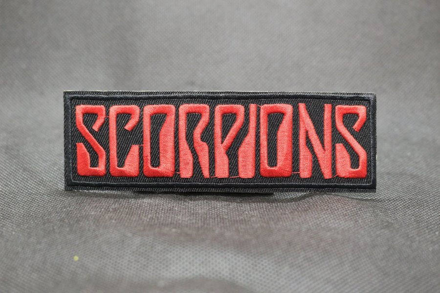 Ett broderat tygmärke med texten "SCORPIONS" i röd färg mot en svart bakgrund.