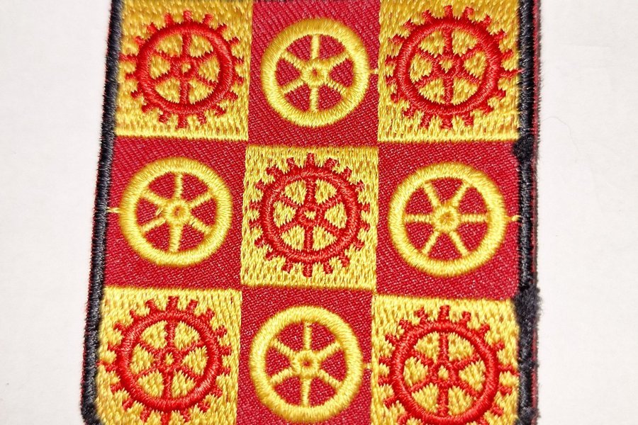 Vävnadsemblem med Vännäs kommunvapen. Vapnet är indelat i ett rutmönster i rött och gult, med sex kugghjul placerade i rutorna. Ovanför vapnet står det "VÄNNÄS" i vita bokstäver.