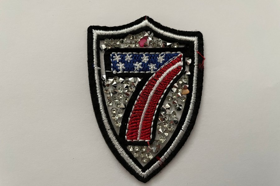 TYGMÄRKE som är dekorerad med glittrande, som ser ut som stenar