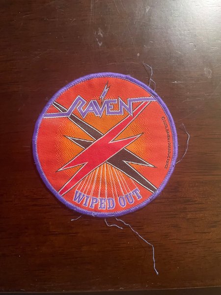 Rund tygmärke med Raven "Wiped Out" design. Märket har en lila kant och ett motiv med texten "Raven" och "Wiped Out" samt blixtar.