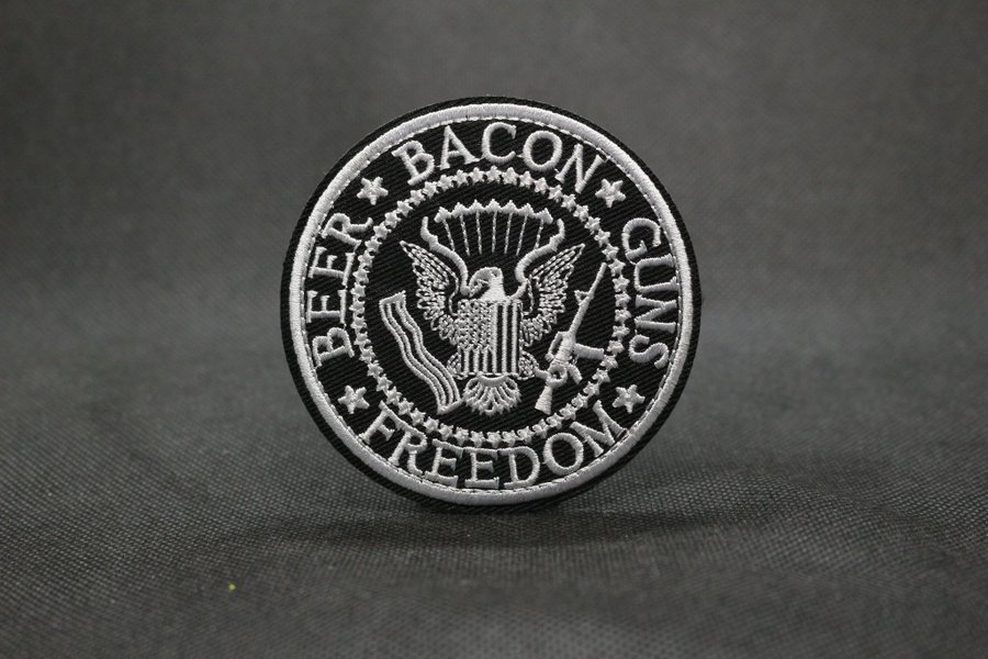 Broderad patch med motiv av en örn omgiven av texten "BEER BACON GUNS FREEDOM".