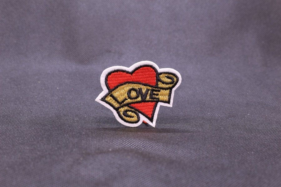 Broderad patch i form av ett rött hjärta med texten "LOVE" på ett guldfärgat band. Patchen har en vit kant.