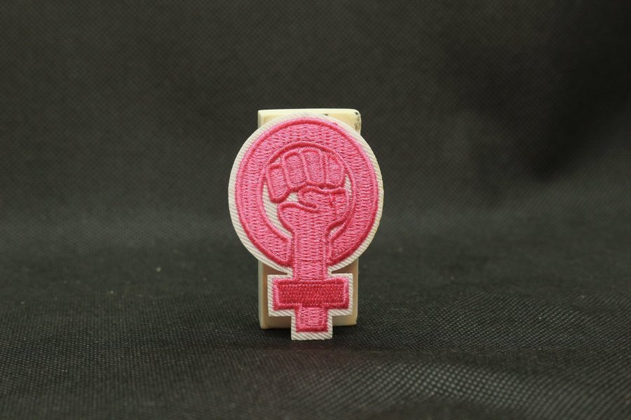 Ett broderat märke med en rosa symbol som representerar kvinnokraft. Märket har en vit kant