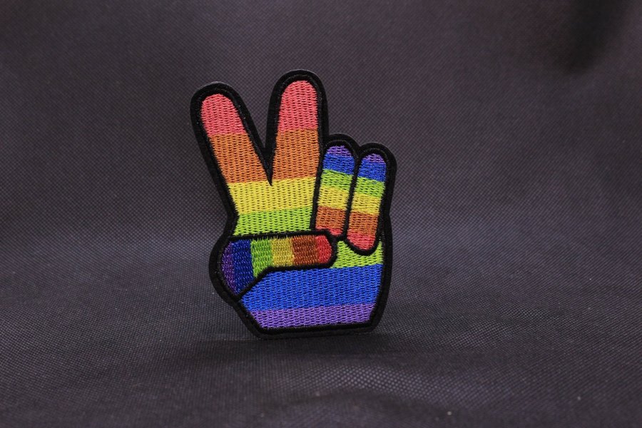 Broderad patch i form av en hand som visar fredstecknet, färgad i regnbågens alla färger. Perfekt för att dekorera kläder eller väskor.