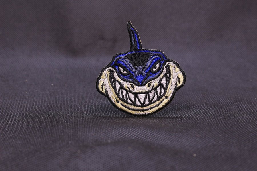 Broderad patch med motiv av ett hajansikte med ett hotfullt uttryck. Patchen har detaljer i svart, blått, vitt och gult.