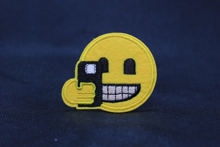 Ett broderat märke i form av en gul emoji som håller för munnen.