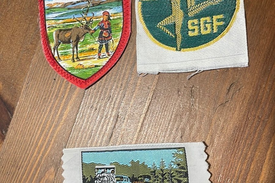 Tre broderade tygmärken. Ett märke visar Hardangervidda med en same och ett ren. Ett annat märke visar SGF med två gymnaster. Det sista märket visar Løveparken Givskud med ett lejon och bilar.