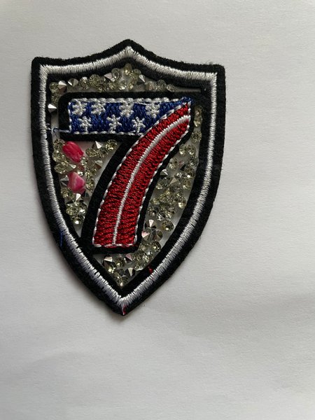 TYGMÄRKE som är dekorerad med glittrande, som ser ut som stenar