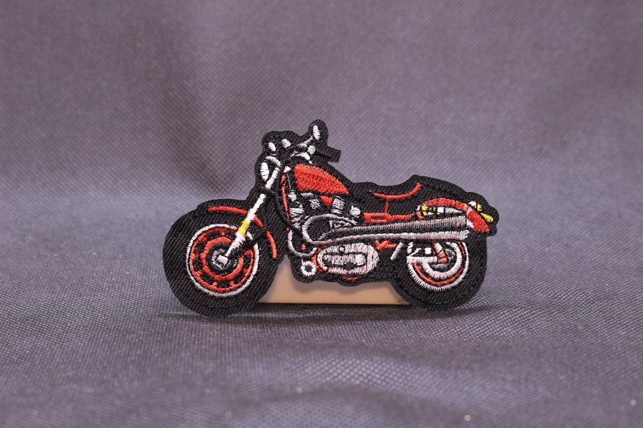 Ett broderat märke i form av en motorcykel. Märket har detaljer i rött, vitt och gult.