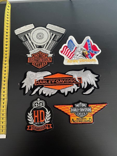 Här är ett set med fem Harley-Davidson tygmärken. De har olika motiv, inklusive Harley-Davidson logotyper, en motor, och en örn med amerikanska och konfedererade flaggor.