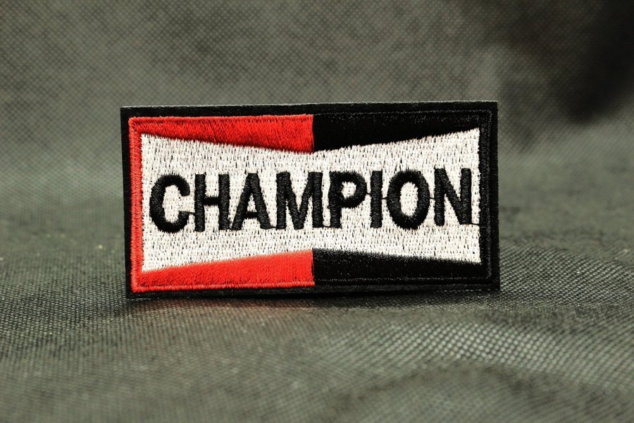 Ett broderat märke med texten "CHAMPION" i svart mot en vit bakgrund. Märket har en svart kant med en röd linje innanför.