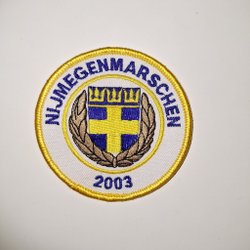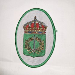 Broderad tygmärke med motiv av Gällivare kompani. Märket är i form av en sköld och har en gul och röd färgkombination med en blå kant. På märket finns det en älg och en symbol som liknar en cirkel med en pil.