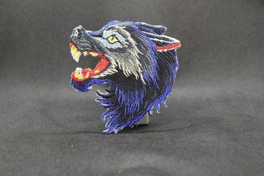 Broderad applikation i form av ett vargansikte med öppen mun. Applikationen har detaljer i blått, svart,
