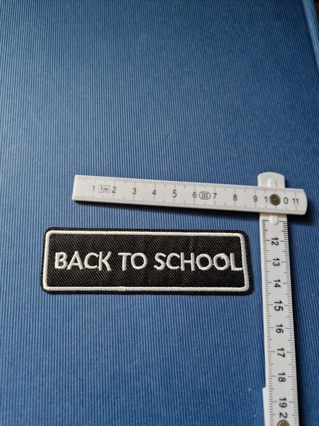 Ett svart tygmärke med texten "BACK TO SCHOOL" broderat i vitt.