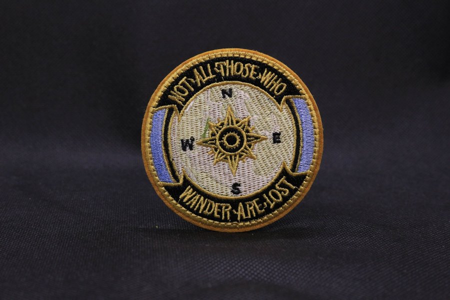 Rund broderad patch med texten "Not all those who wander are lost" runt en kompassros med N, S, V och Ö.