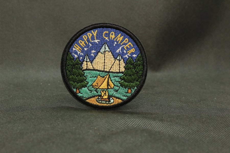 En broderad applikation föreställande Happy Camper. Perfekt för att dekorera kläder eller väskor.