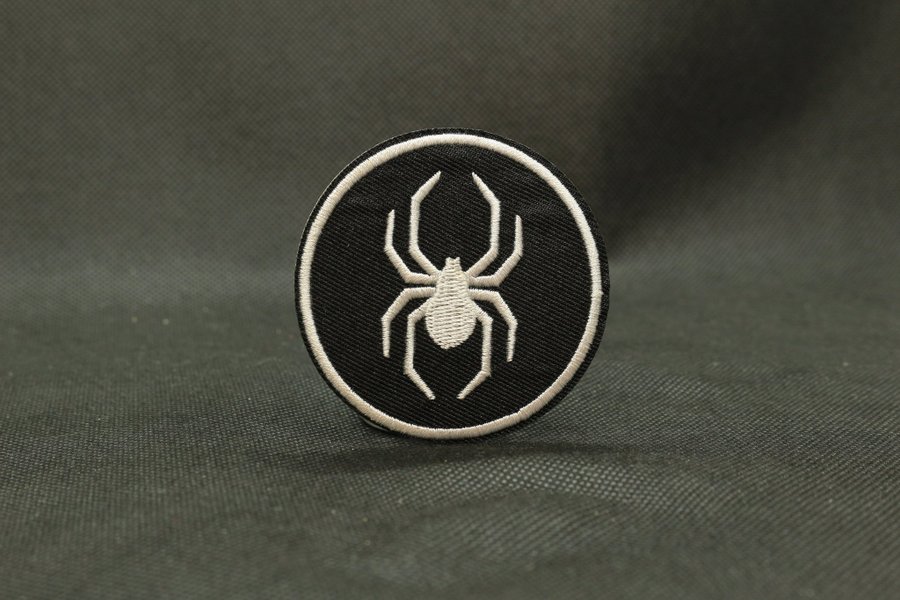 Rund patch med en broderad spindel i vitt mot en svart bakgrund. Patchen har en vit kant.