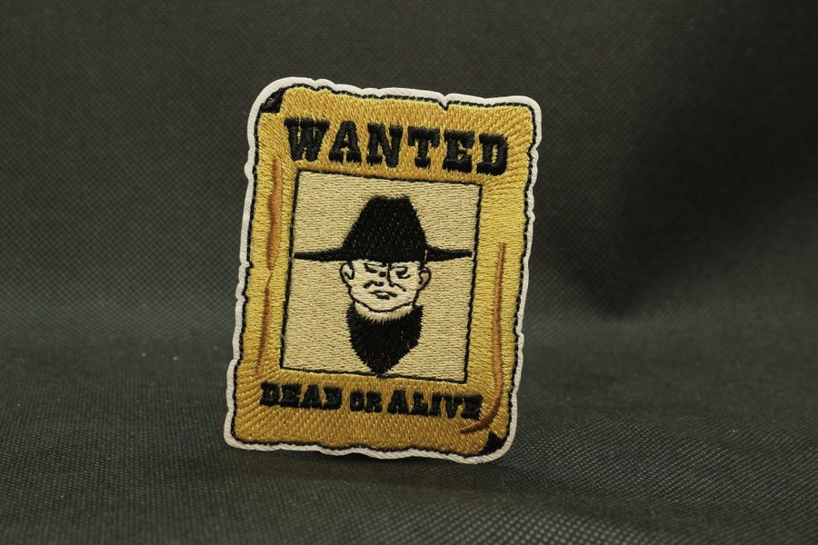 Broderad patch föreställande en efterlysningsaffisch med texten "WANTED" och "DEAD OR ALIVE". Motivet visar en karaktär med hatt .