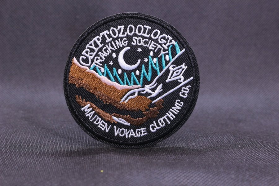 Broderad patch med motiv av ett landskap med en måne och texten "CRYPTOZOOLOGY TRACKING SOCIETY" och "MAIDEN VOYAGE CLOTHING CO.".