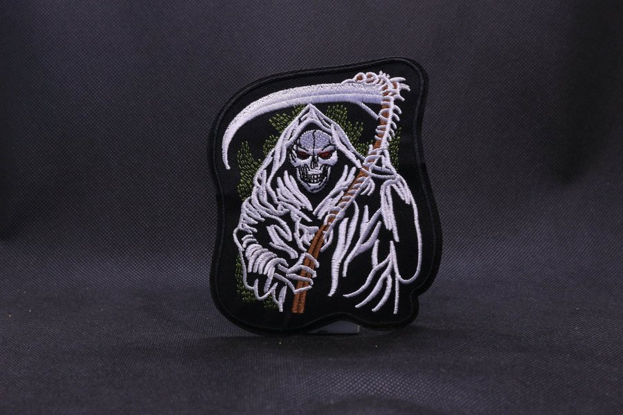 Broderad patch med motiv av liemannen med lie. Patchen har en svart bakgrund och detaljer i vitt, grått, brunt och grönt.