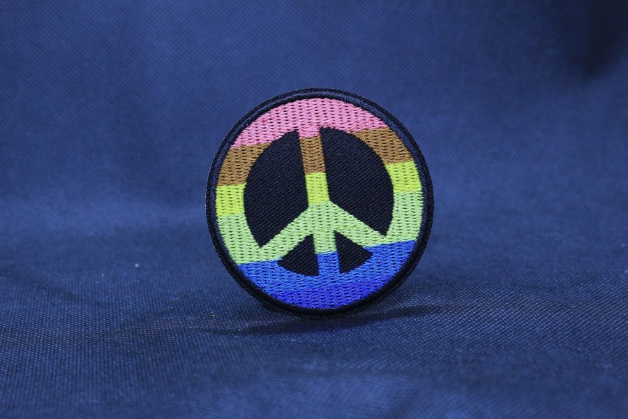 Detta är ett runt tygmärke med ett fredsmärke i regnbågens färger. Märket har en svart kant.